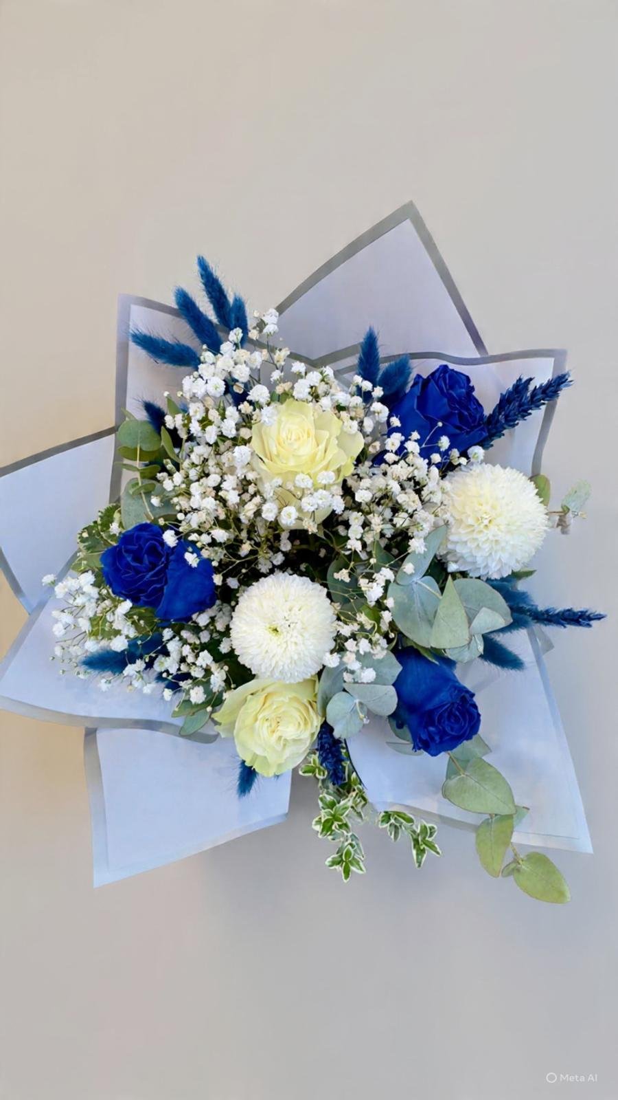 Ramo de Rosas Azules y Blancas Sofisticado ramo elaborado con rosas azules y blancas, crisantemo unitario y una selección de verdes variados. Incluye eucalipto natural que aporta frescura, fragancia y un toque especial al diseño. Un arreglo elegante y moderno, ideal para sorprender en cumpleaños, aniversarios o como un detalle especial lleno de estilo.