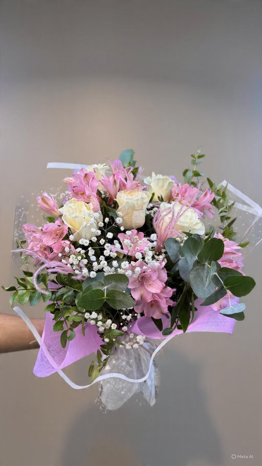 Delicado ramo de rosas blancas combinado con alstroemeria rosa, paniculata y eucalipto natural, que aportan frescura, suavidad y un toque elegante. Un arreglo refinado y armonioso, ideal para regalar en cualquier ocasión especial.